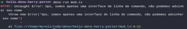Por exemplo, uma abordagem, pode ser receber o nome quando o programa é executado, desta forma: deno run mod.ts "Harry Potter". Bora lá?