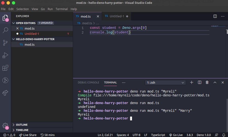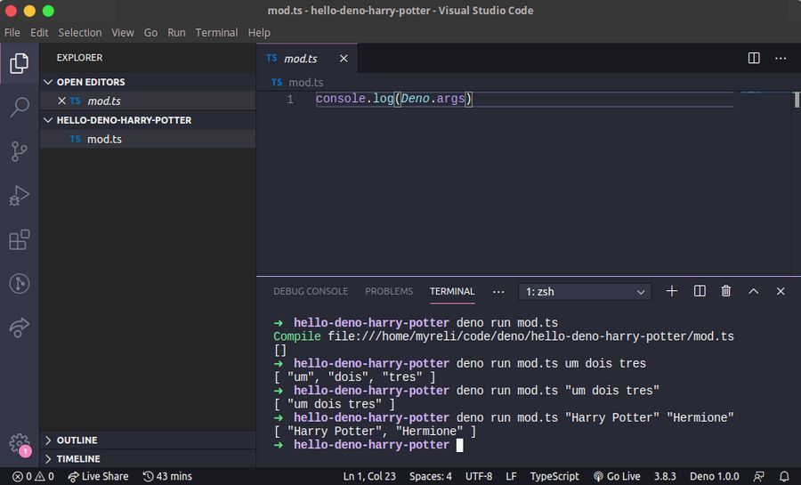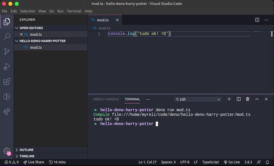 Nele escreva um simples console.log('tudo ok! =D'), salve as modificações (ctrl + s) e no terminal execute deno run mod.ts para garantir que está tudo nos conformes: