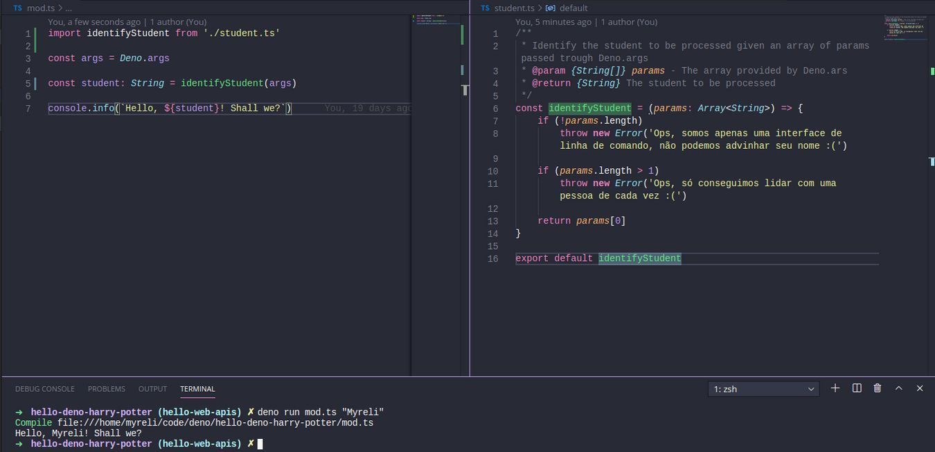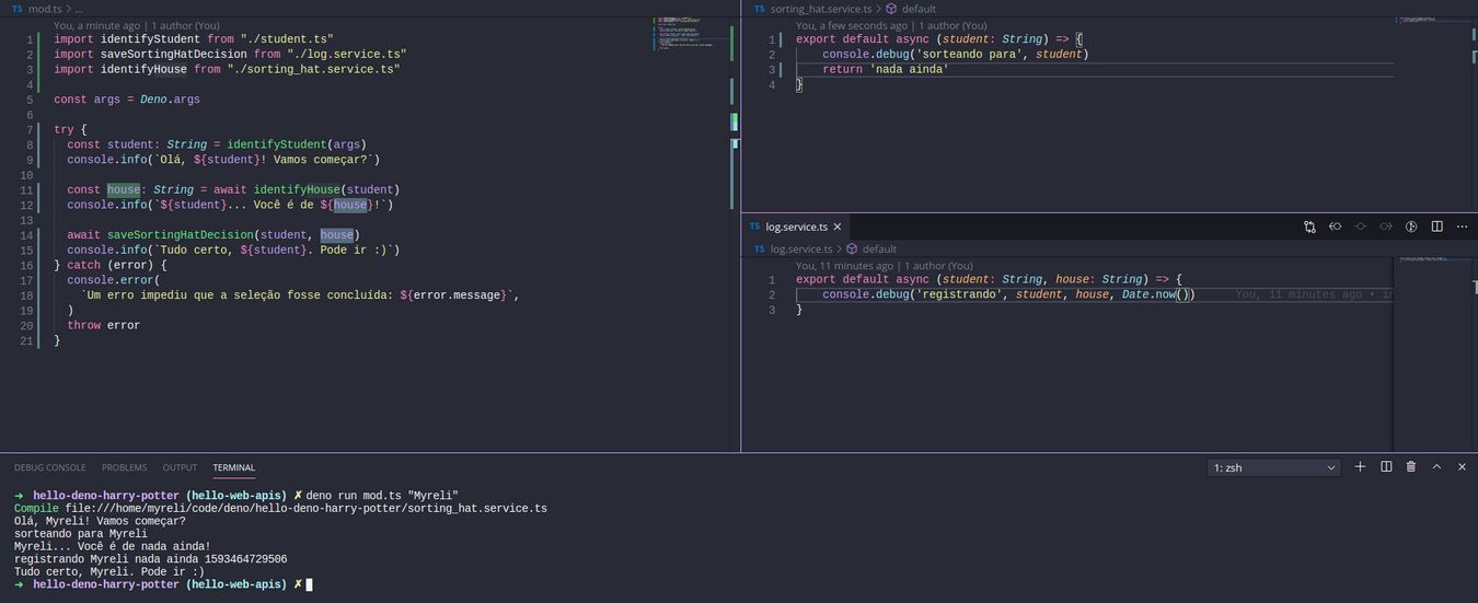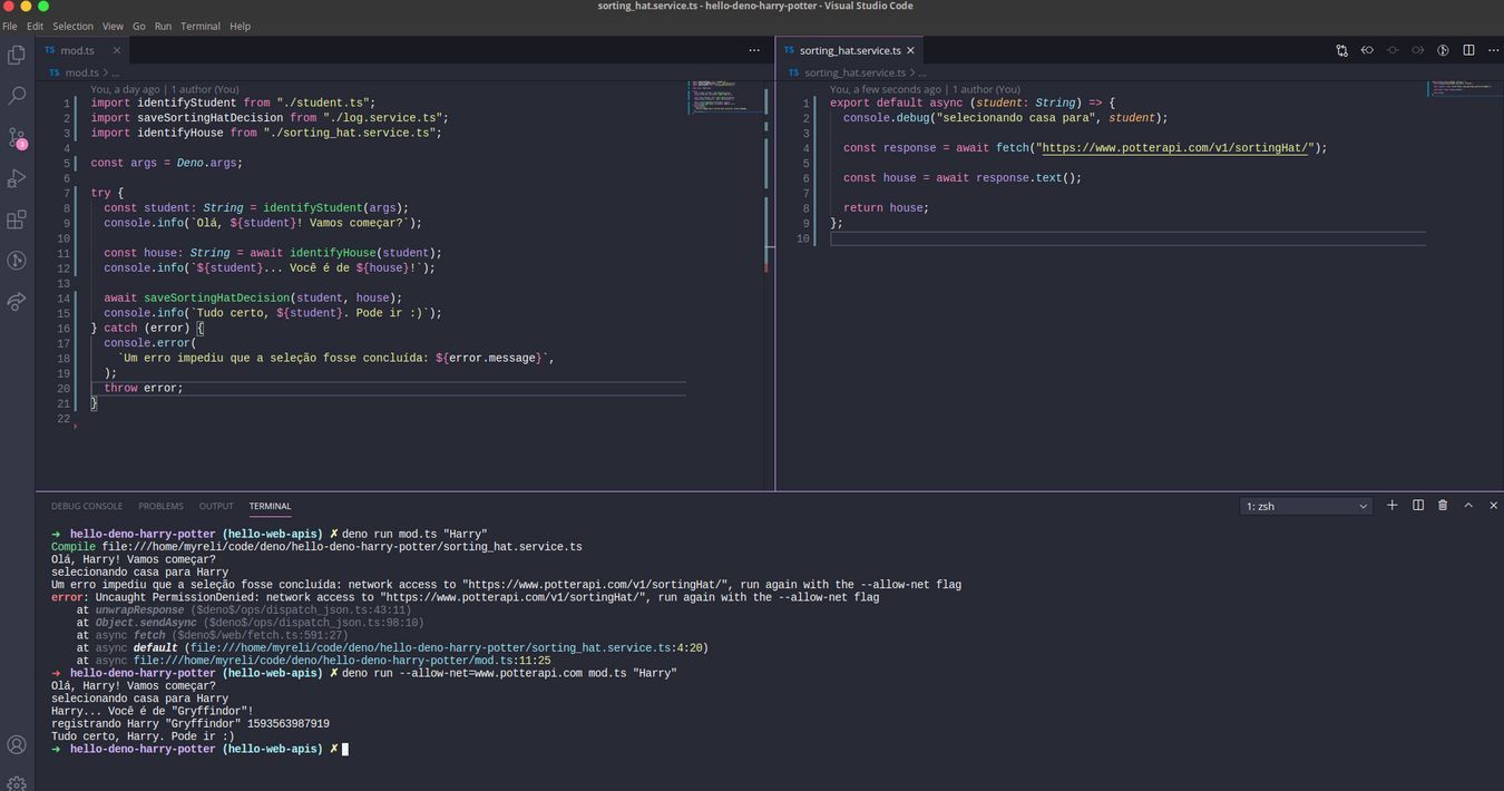Lembra a introdução sobre Deno em que fizemos uma chamada no terminal para o chapéu seletor e ele dizia qual era a casa?